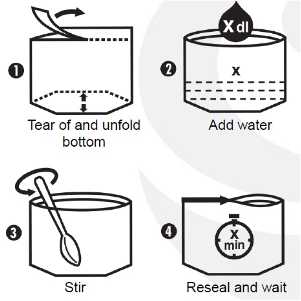 Het bereiden van deze ontbijtmaaltijd is uiterst eenvoudig. Scheur de bovenkant van de zak af en vouw de onderkant uit. Voeg langzaam heet water toe, roer terwijl je giet en sluit vervolgens de zak. Na 8-10 minuten is jouw maaltijd gerehydrateerd en klaar om te genieten. Voor bereiding met koud water, verleng de tijd tot meer dan 30 minuten.