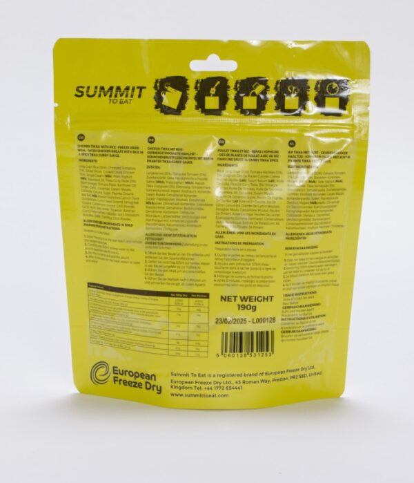 De Kip Tikka met Rijst van Summit to Eat met 665 kilocalorieën is ideaal voor buitensporters, preppers, militairen en avontuurlijke reizigers die behoefte hebben aan een voedzame, maar lichtere hoofdmaaltijd. Deze portie is perfect afgestemd op wie bewust wil omgaan met gewicht en calorie-inname zonder concessies te doen aan smaak, kwaliteit of gemak. Voor kortere tochten, milde inspanning of als onderdeel van een flexibele voorraad voor noodsituaties biedt dit gerecht precies de juiste balans tussen draagbaarheid, energie en comfort.