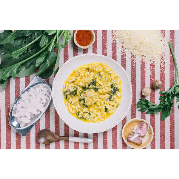 Langkorrelige rijst 42%, saus 29% (water, olijfolie, zout, gemodificeerd maïszetmeel, knoflook, paprika, kleurstof (bèta-caroteen), suiker, peterselie, gistextract en nootmuskaat), kabeljauw 15%, gepocheerde ui 7% ( ui, zonnebloemolie en karamel), spinazie 7%.
