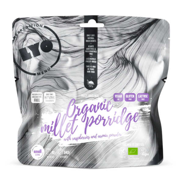 Onze gierstpap maakt jouw dag helemaal goed! Biologische gierst gekookt in kokosmelk en gemengd met biologisch aroniapoeder. Voor een meer fruitige smaak hebben we biologische frambozen toegevoegd. Begin uw dag goed en ga voor uw avontuur!
